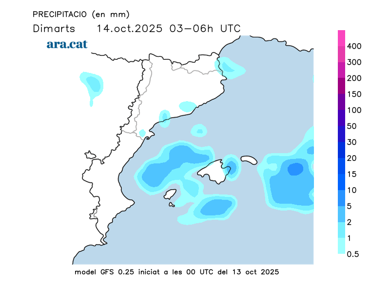 Acumulació de precipitació prevista per trams de 3 hores (dades en l/m²).