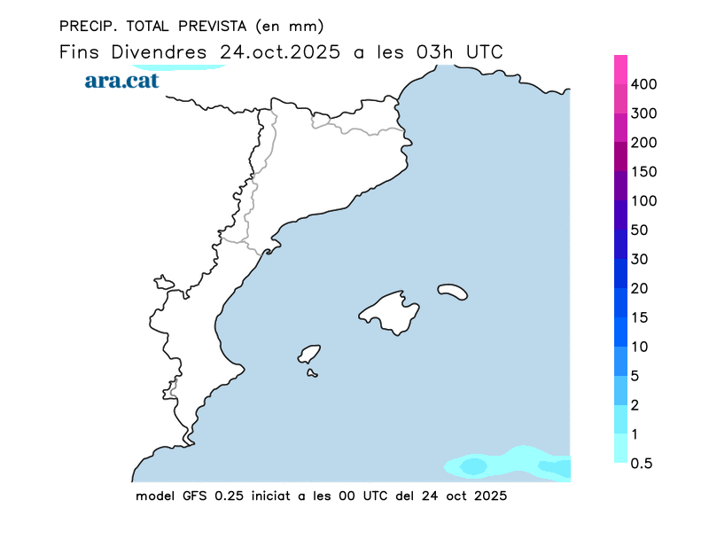Acumulació total de precipitació prevista des de l’inici de la sortida del model (dades en l/m²).