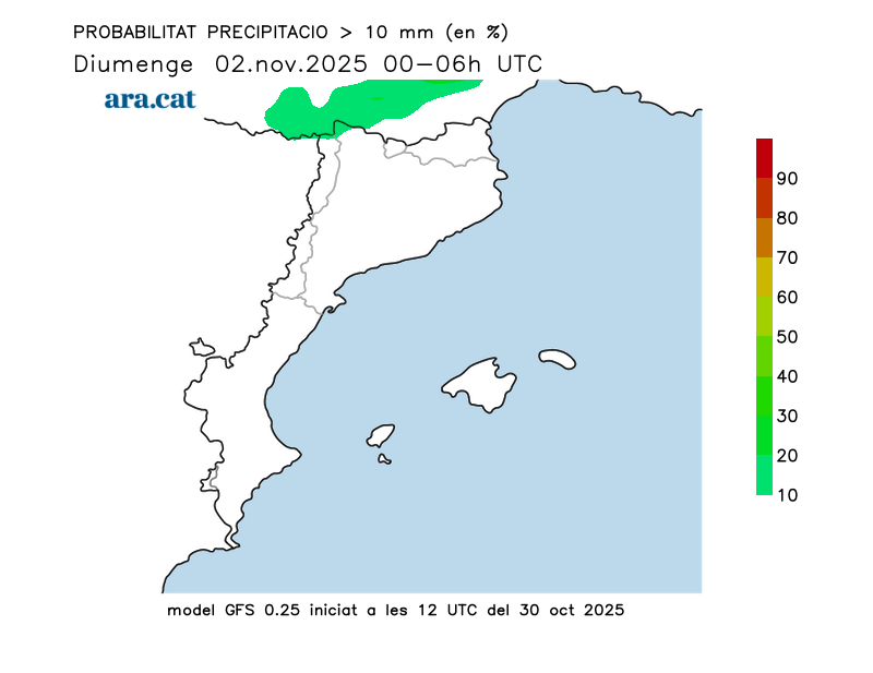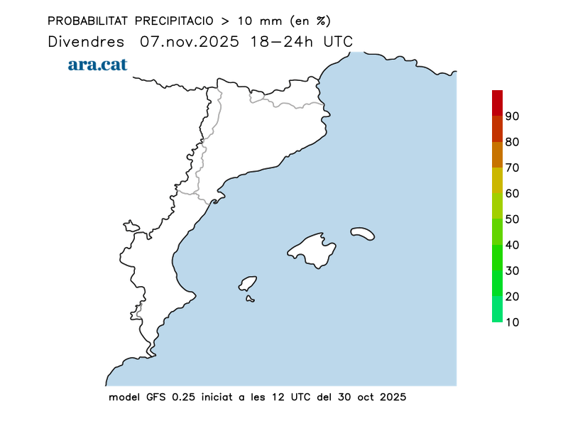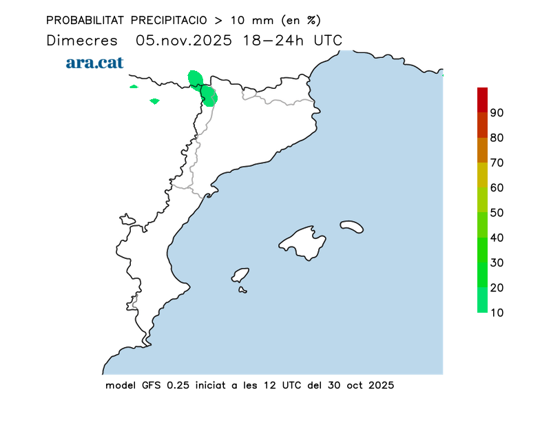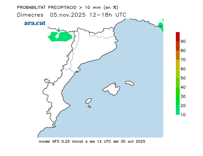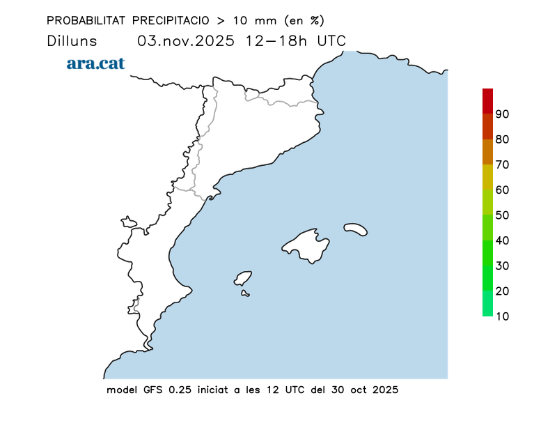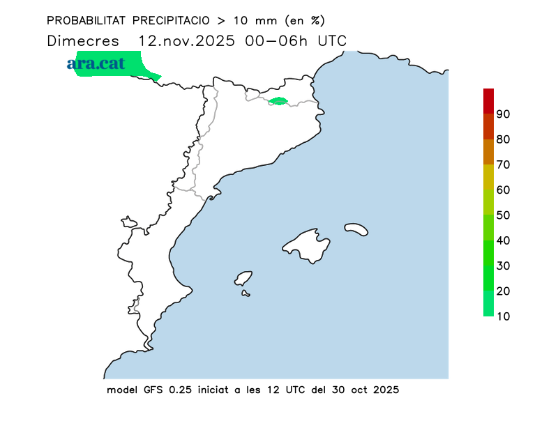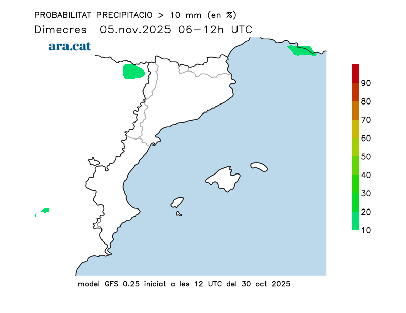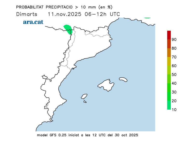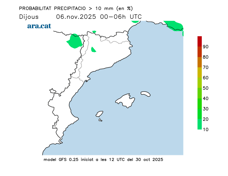 Probabilitat en tant per cent que s’acumulin més de 10 l/m² per trams de 6 hores.