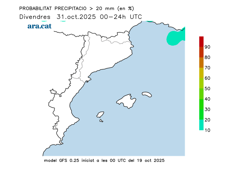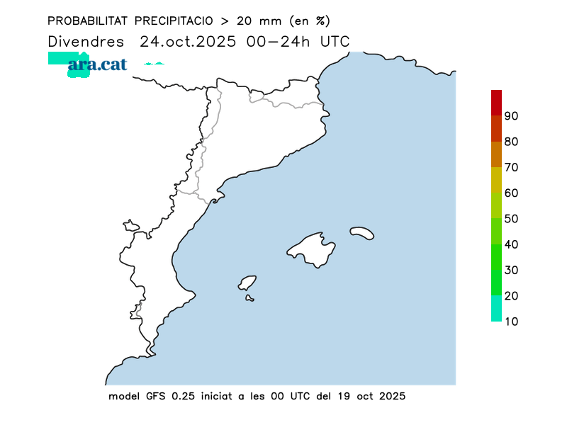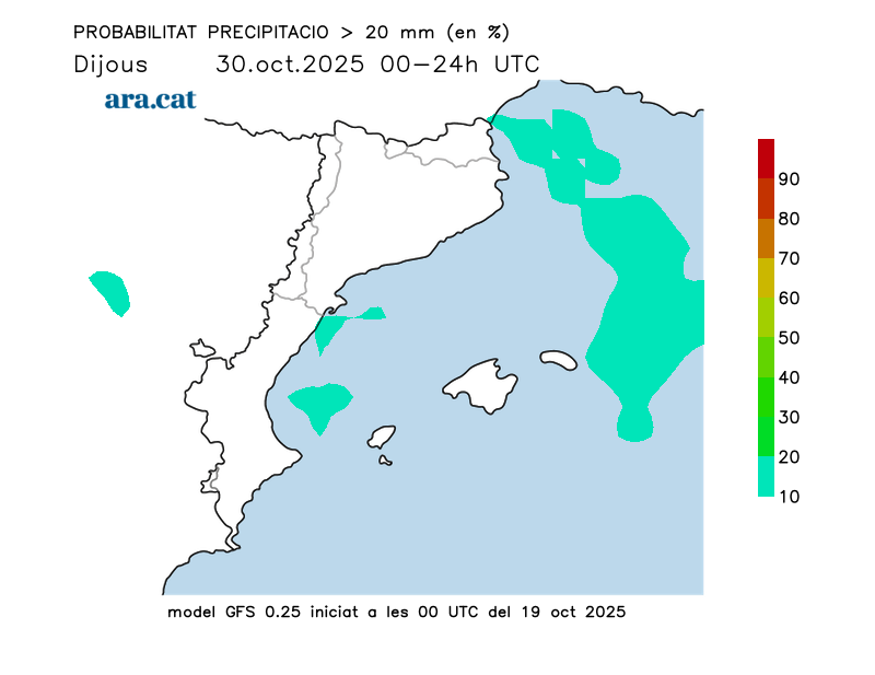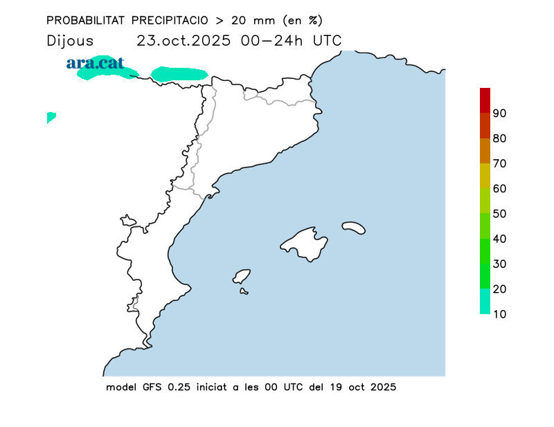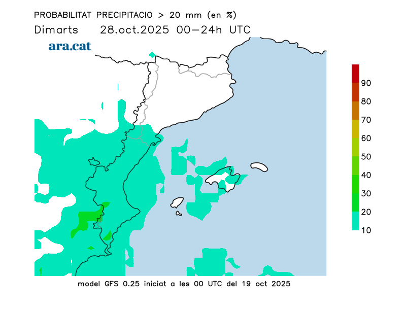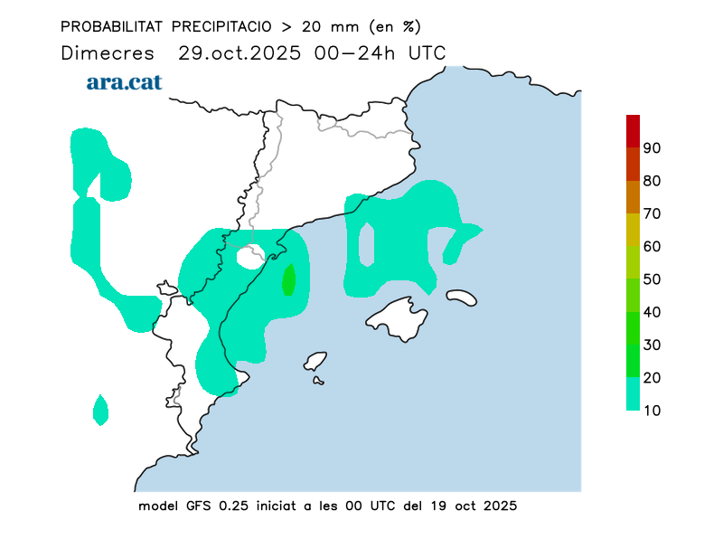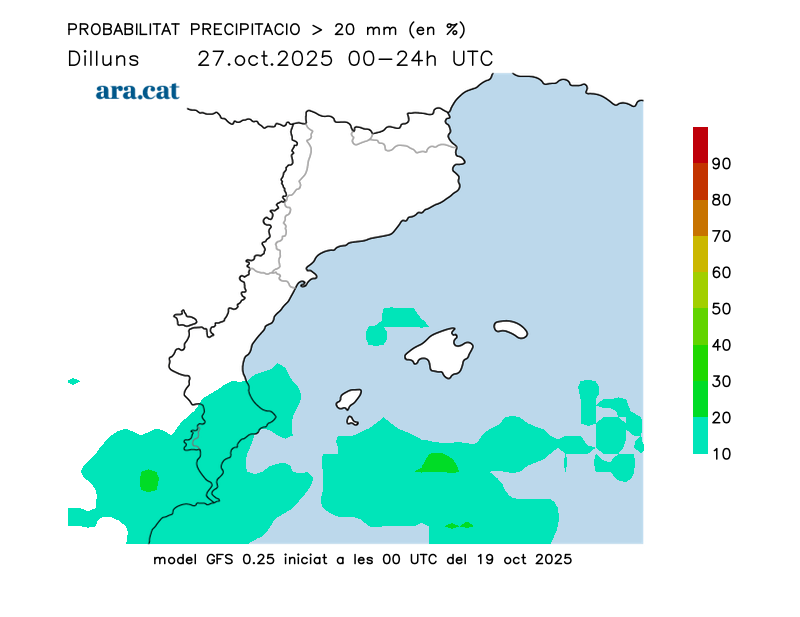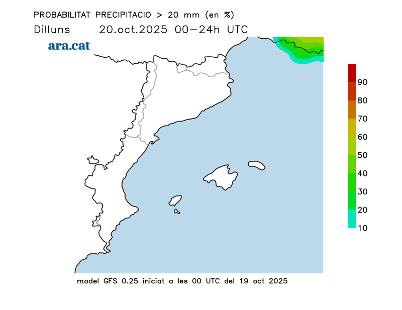 Probabilitat en tant per cent que s’acumulin més de 20 l/m² per dies.