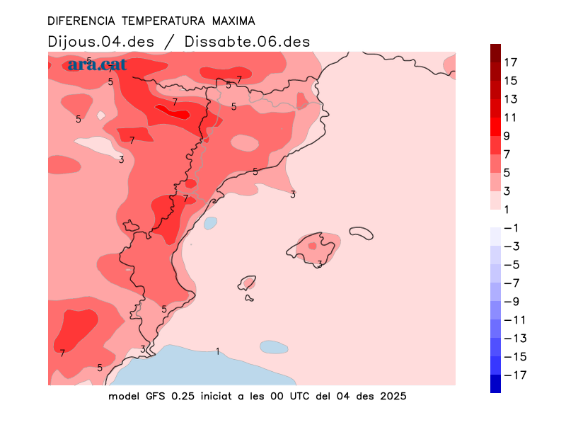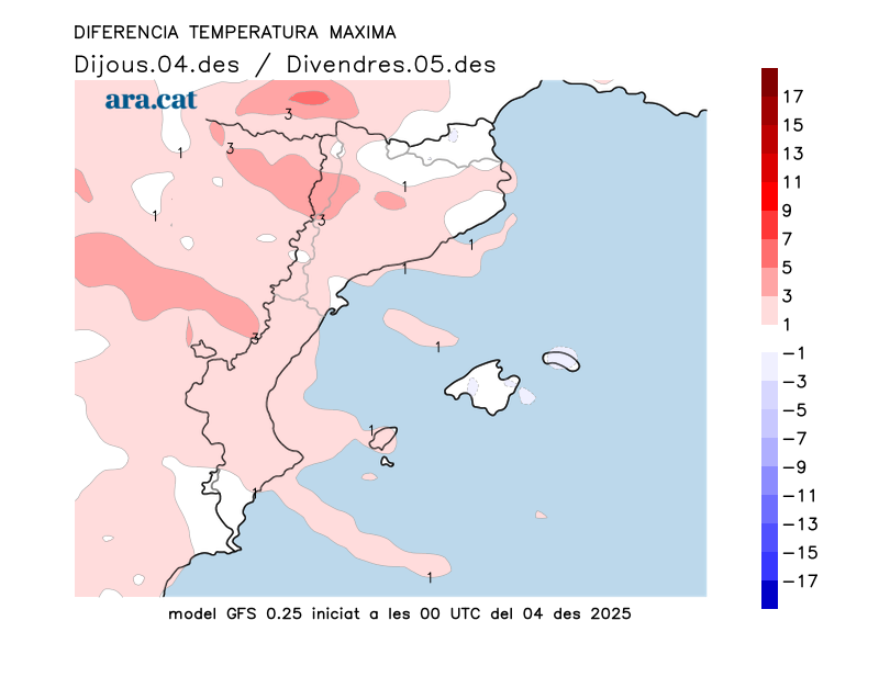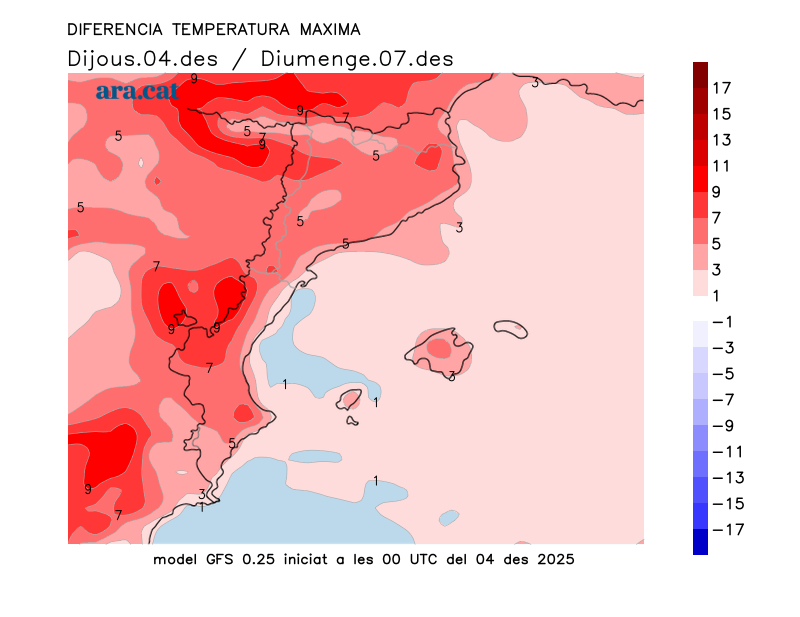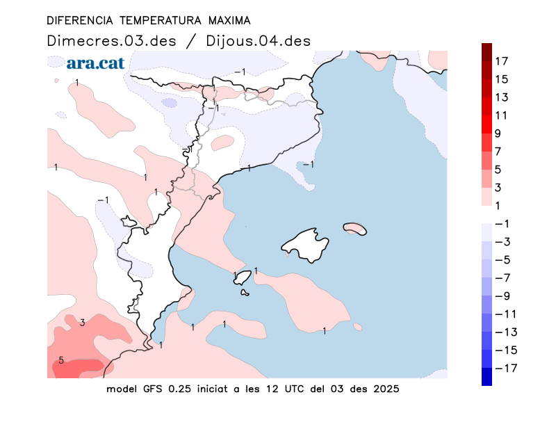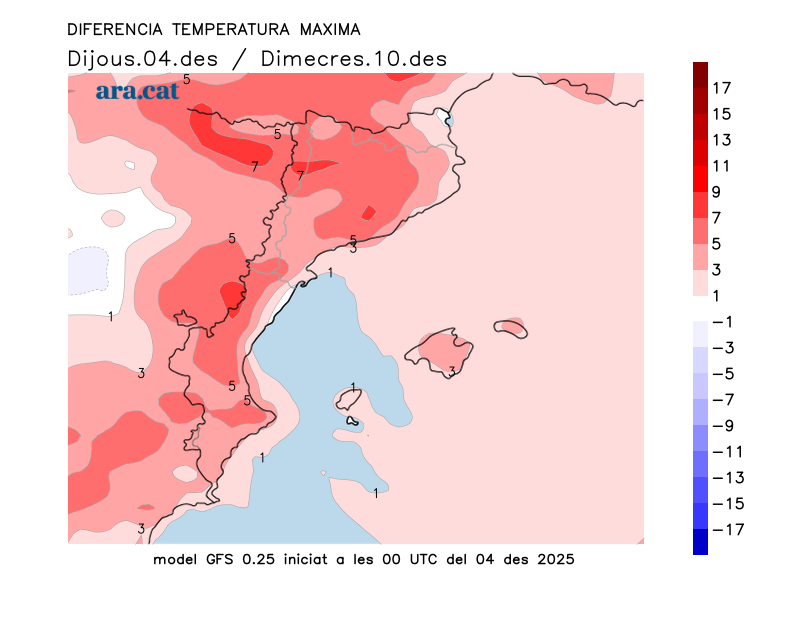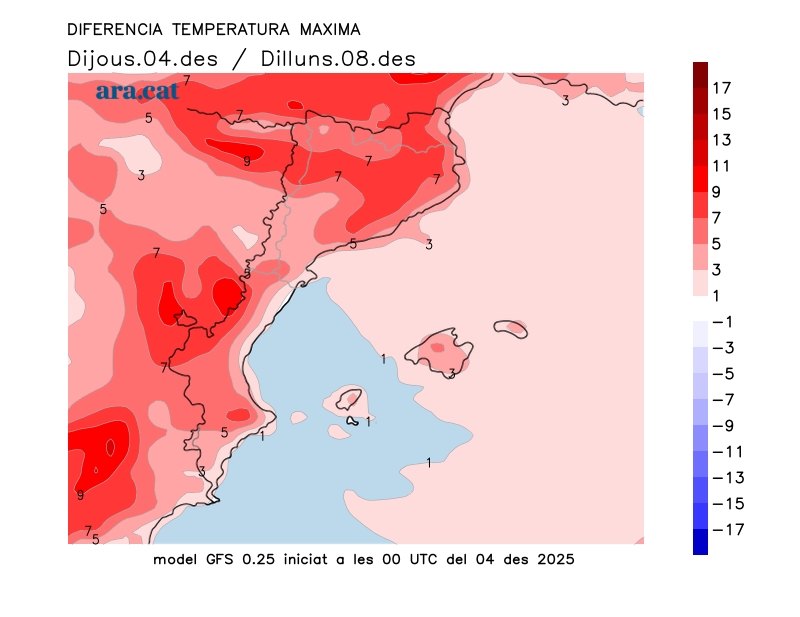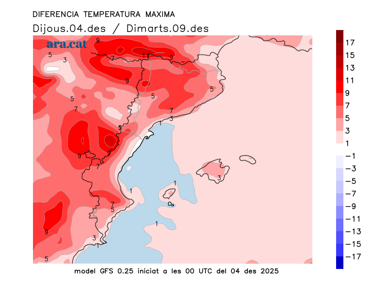 Diferència prevista entre la temperatura màxima d’avui i la dels pròxims dies (dades en ºC).