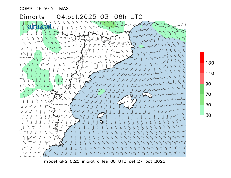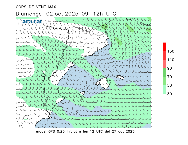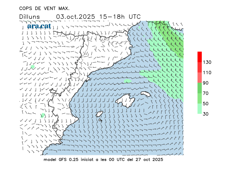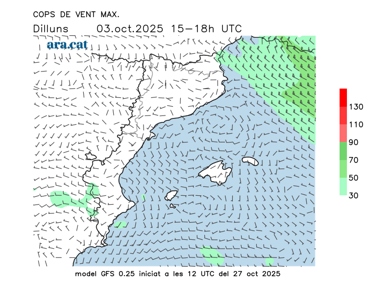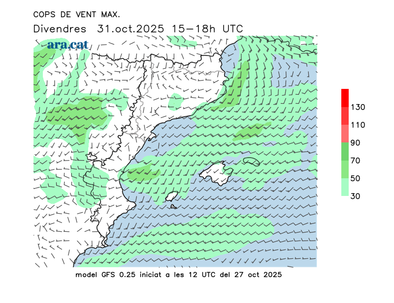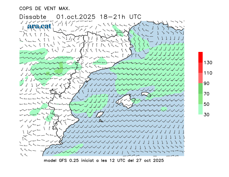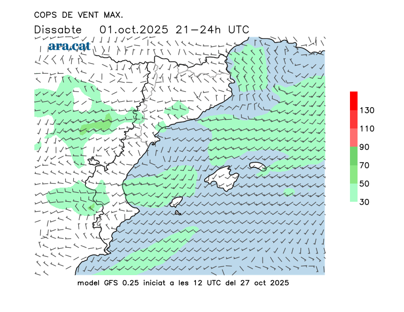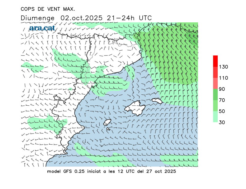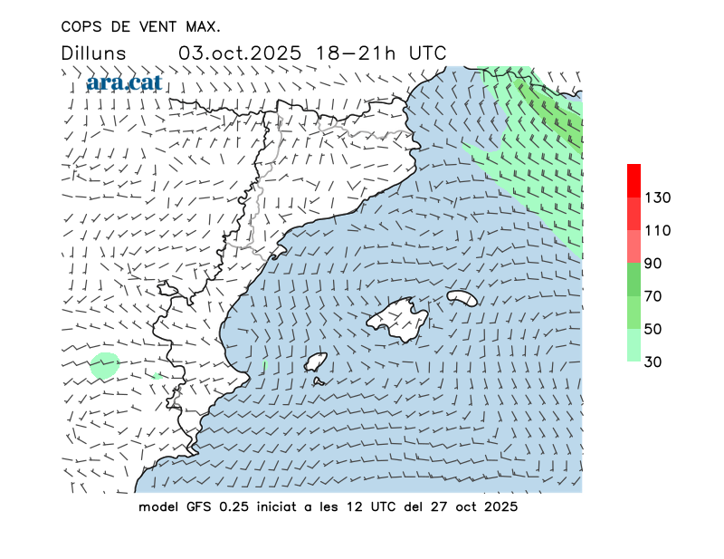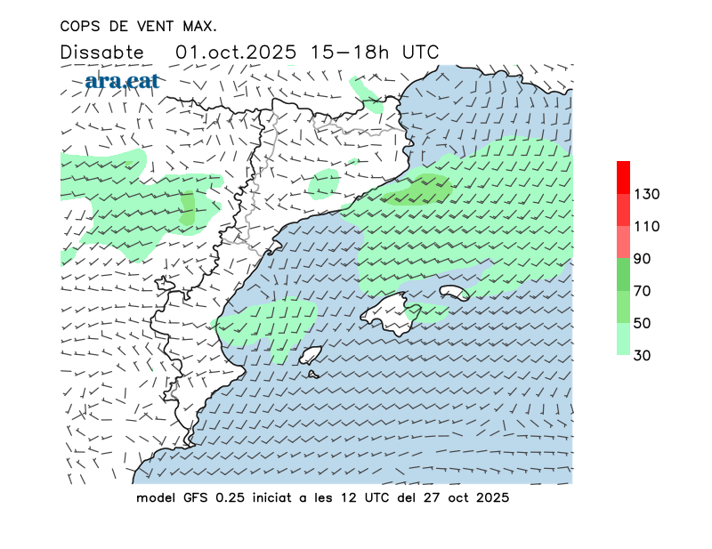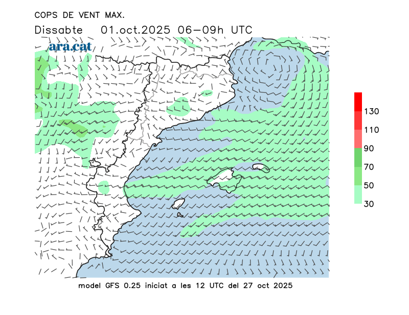 Vent en superfície (direcció i cops màxims previstos)