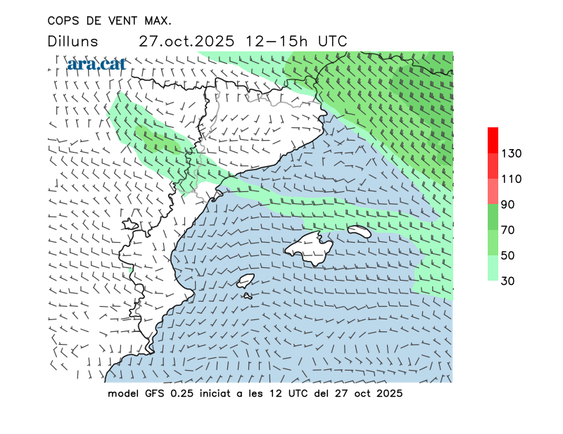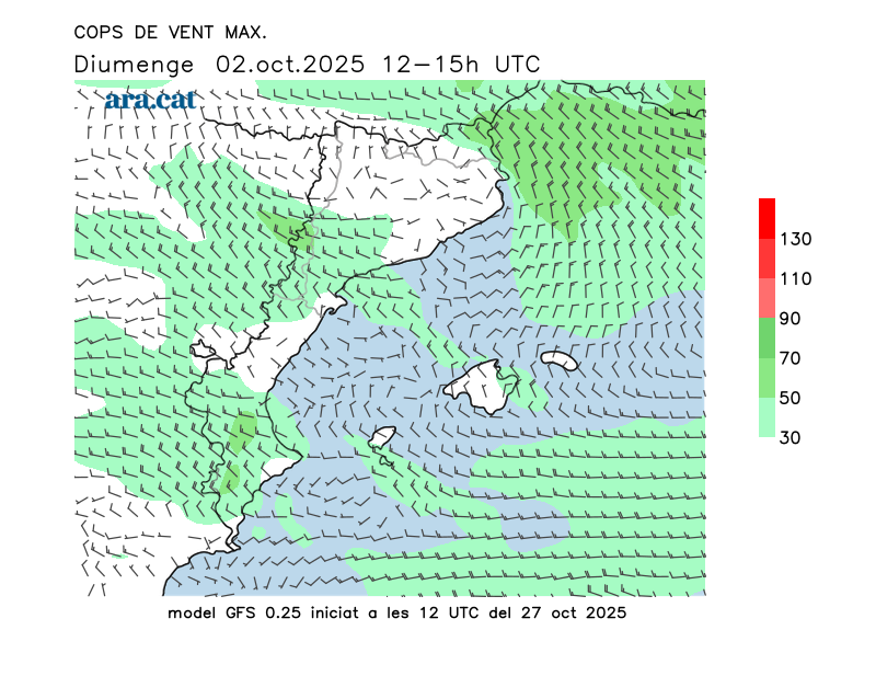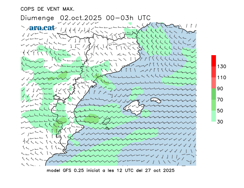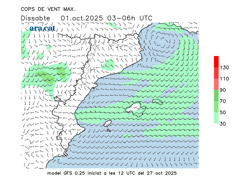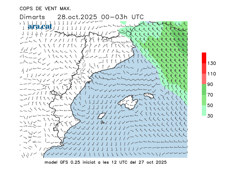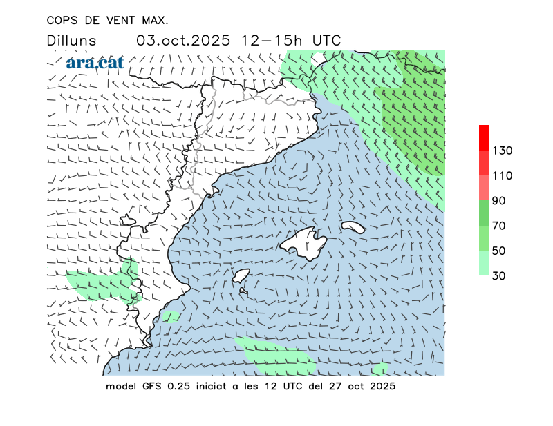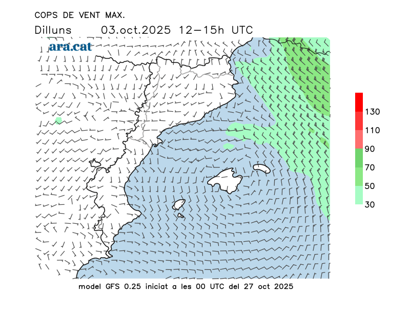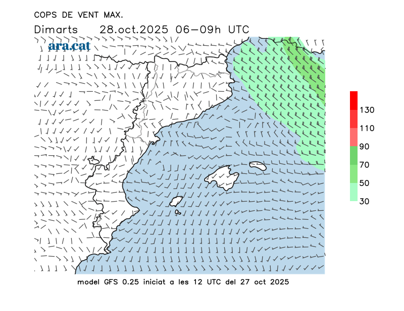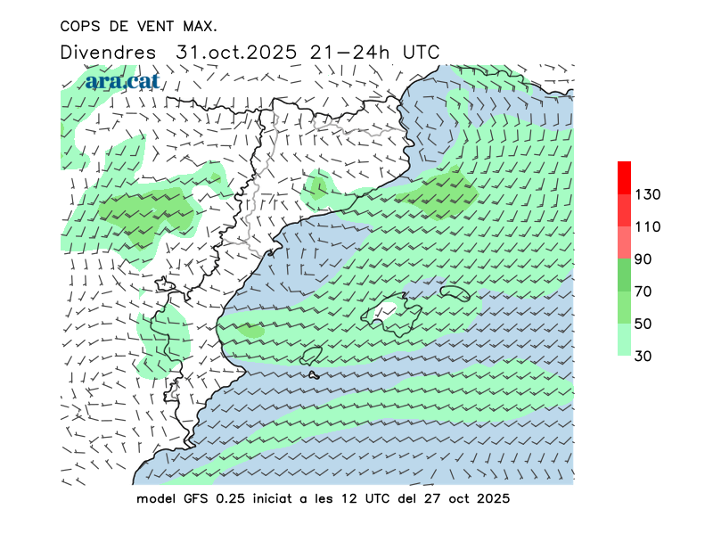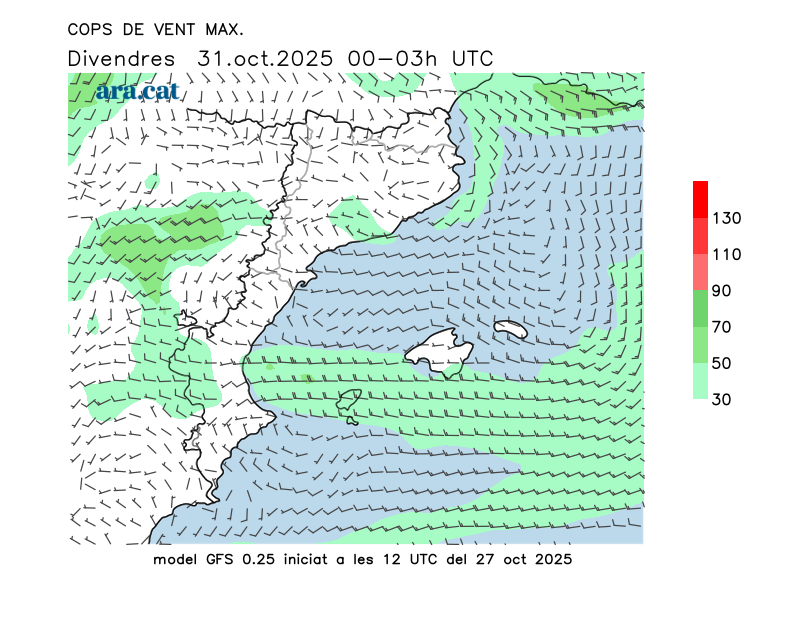 Vent en superfície (direcció i cops màxims previstos)
