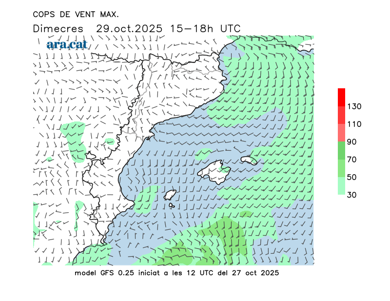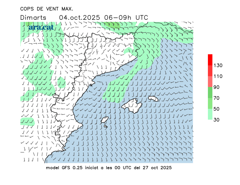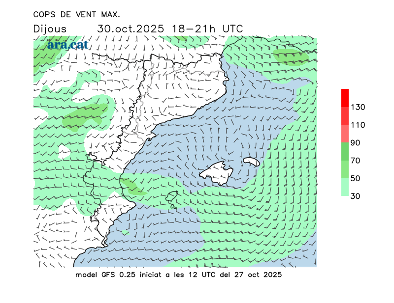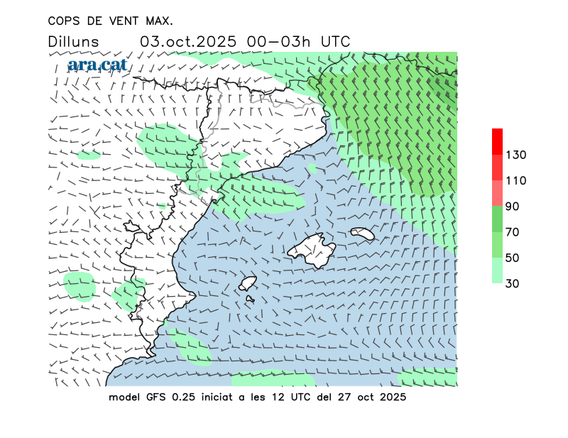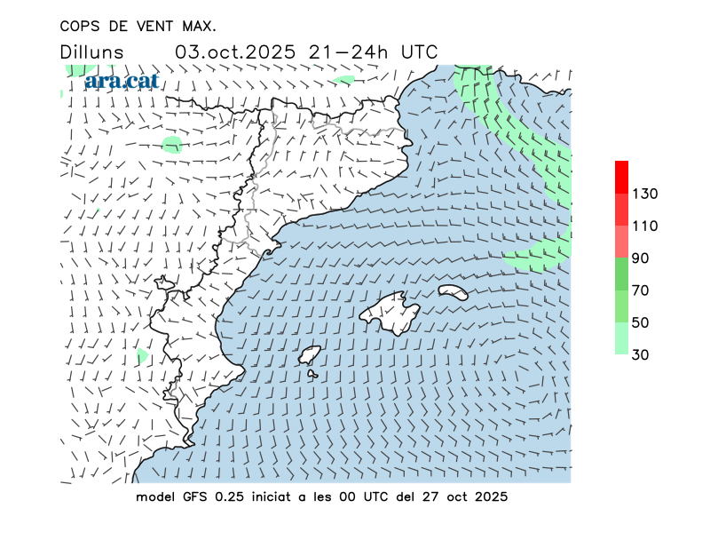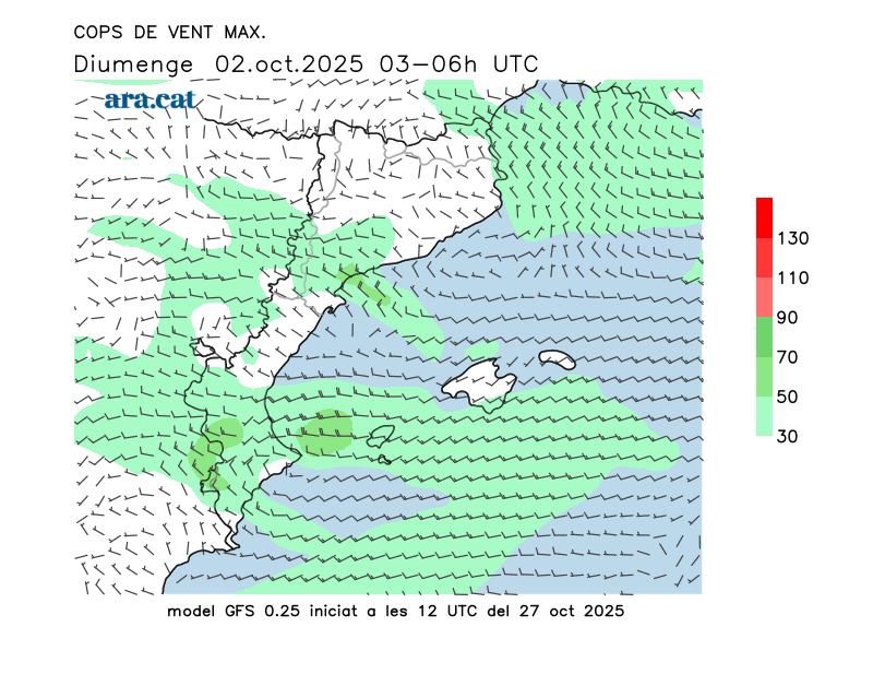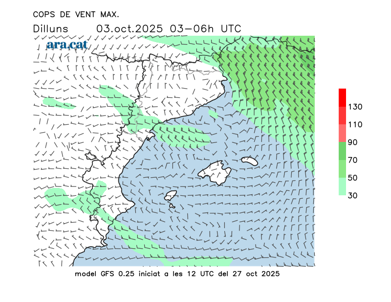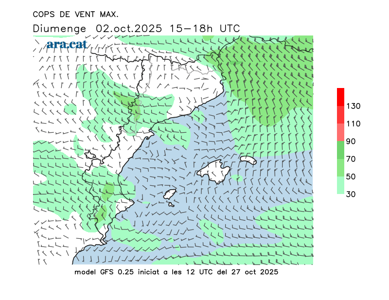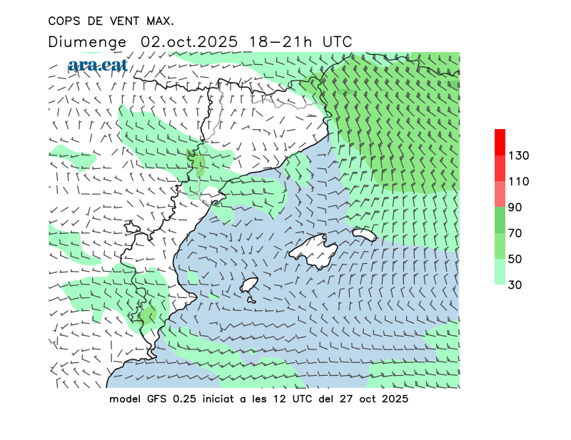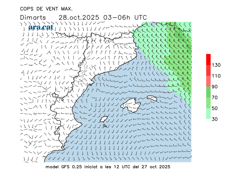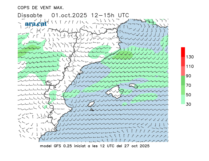 Vent en superfície (direcció i cops màxims previstos)