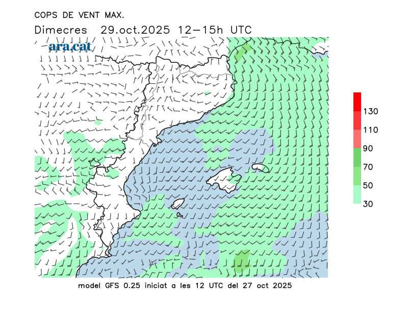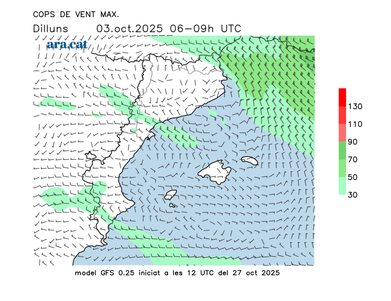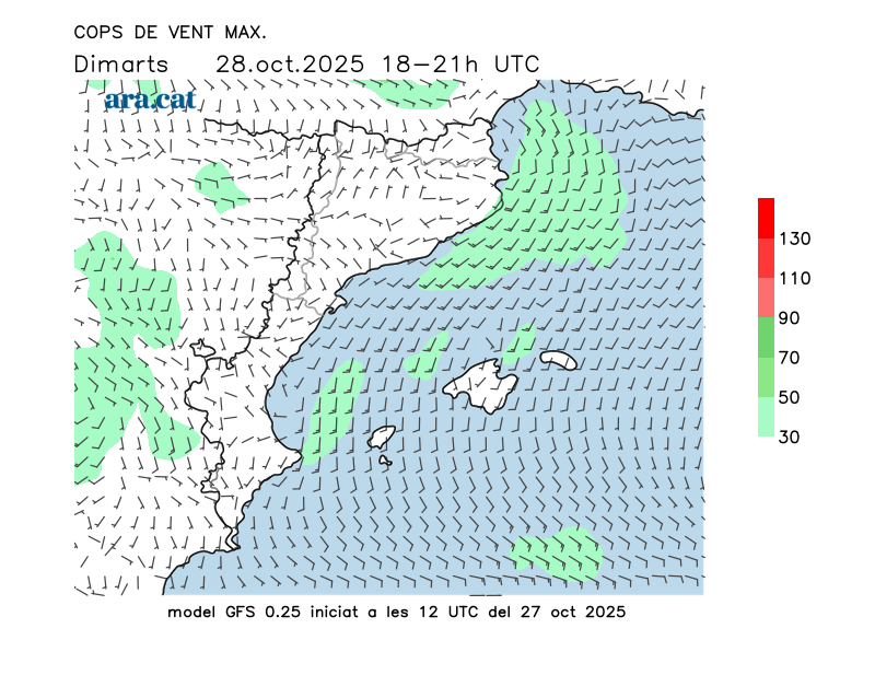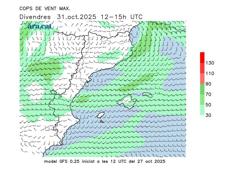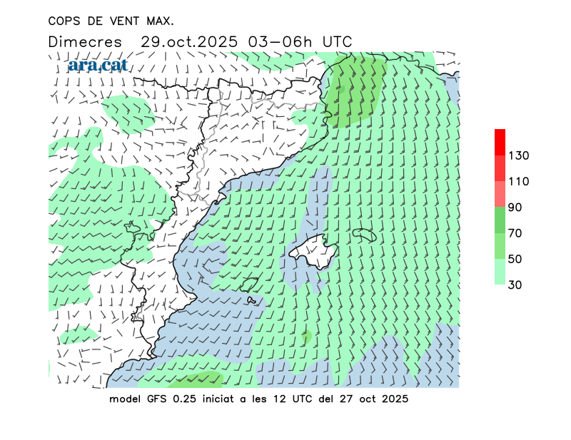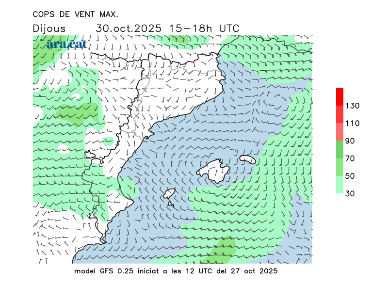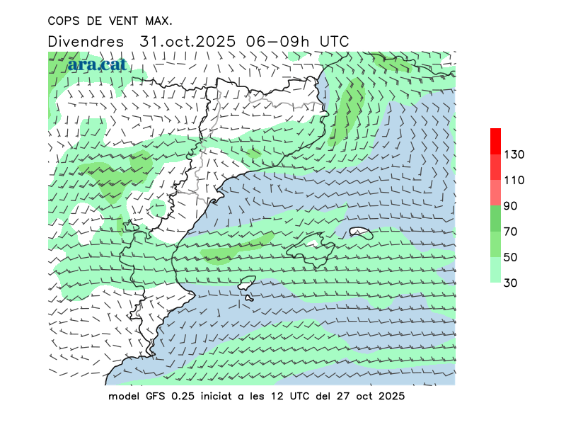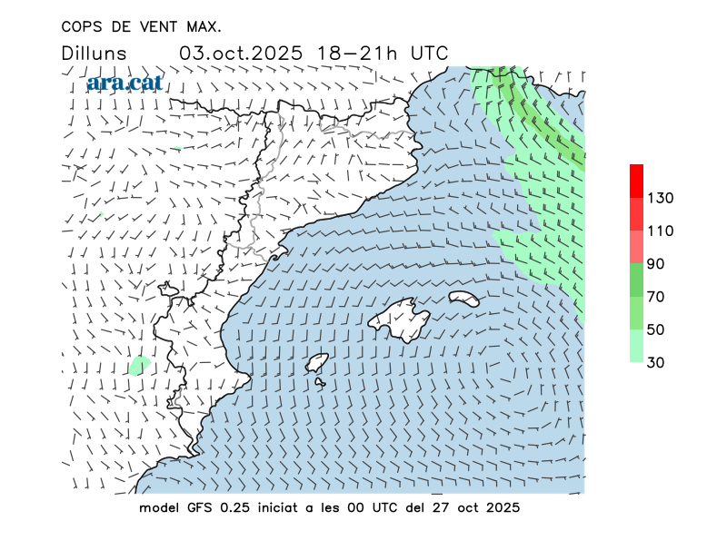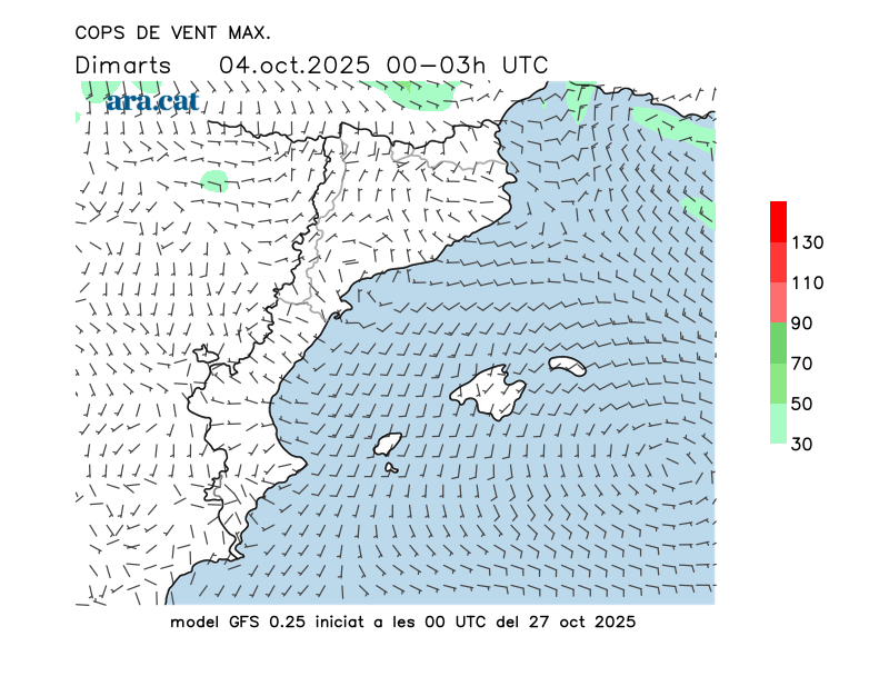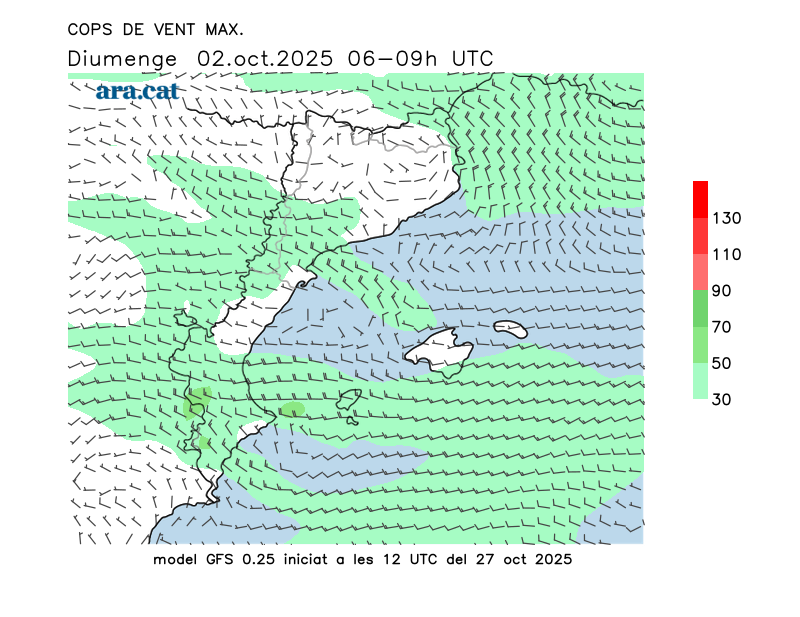 Vent en superfície (direcció i cops màxims previstos)
