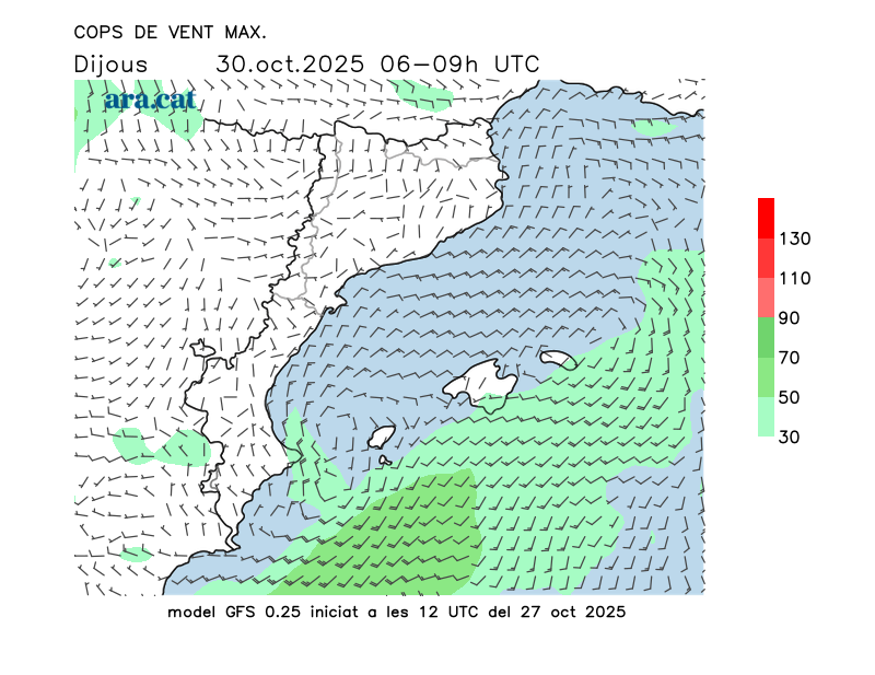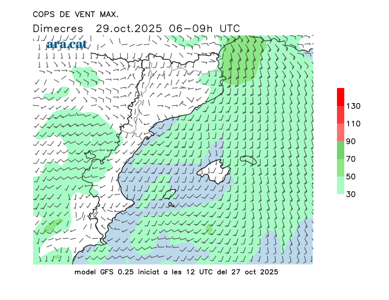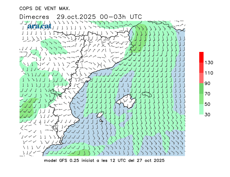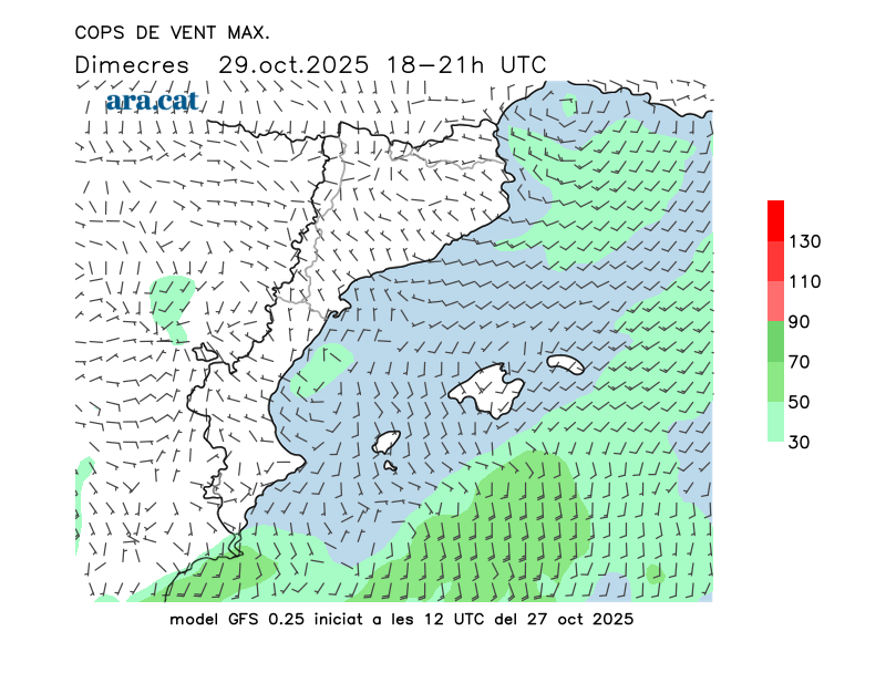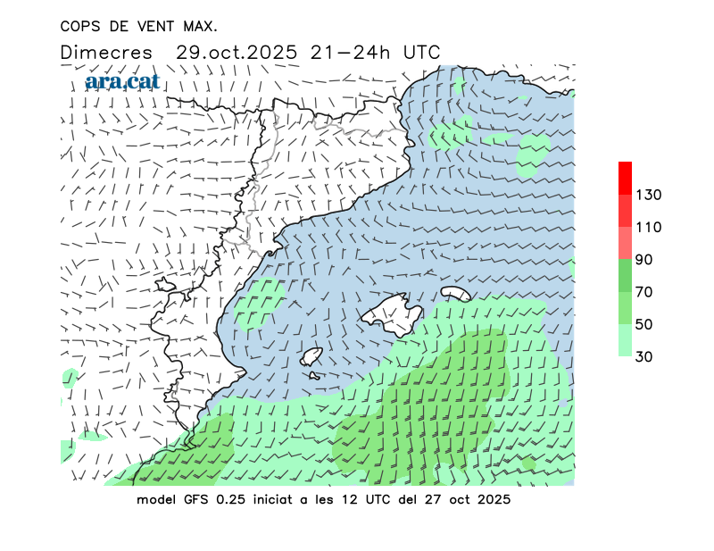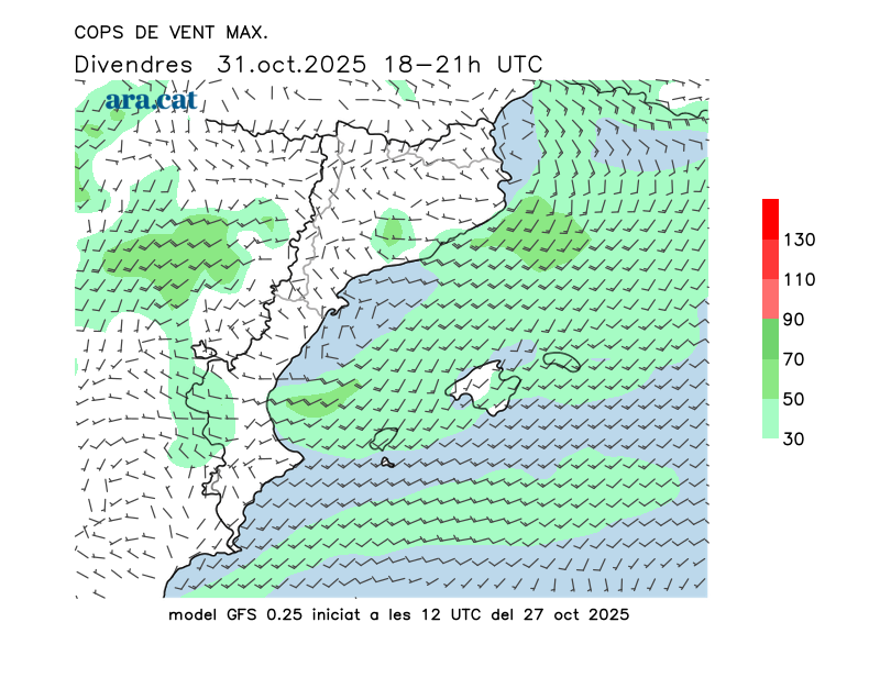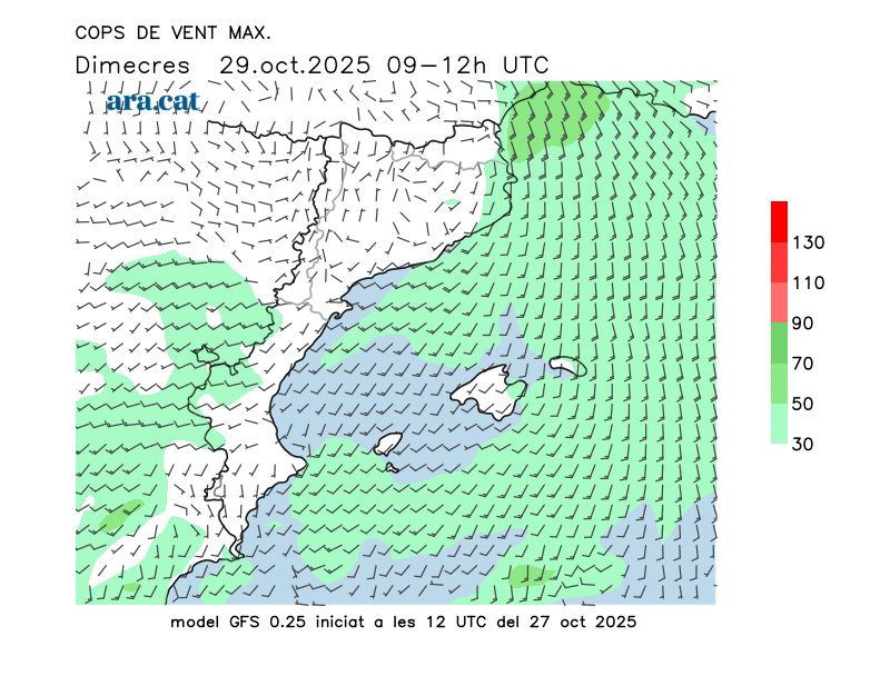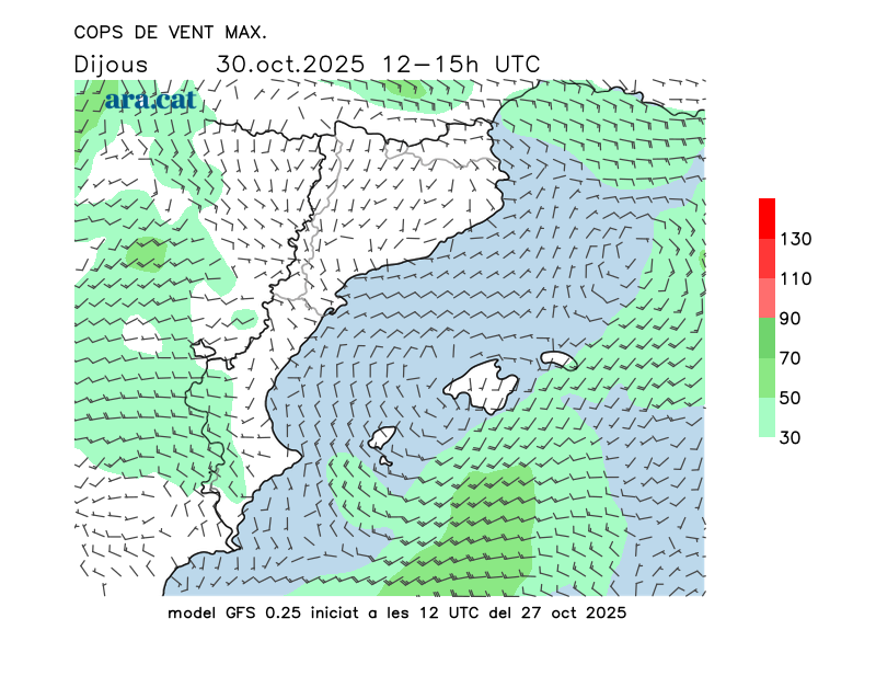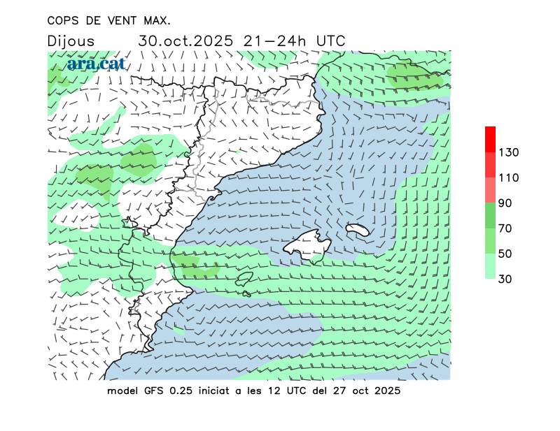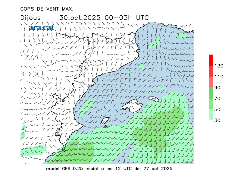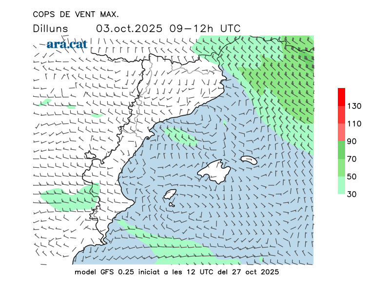 Vent en superfície (direcció i cops màxims previstos)