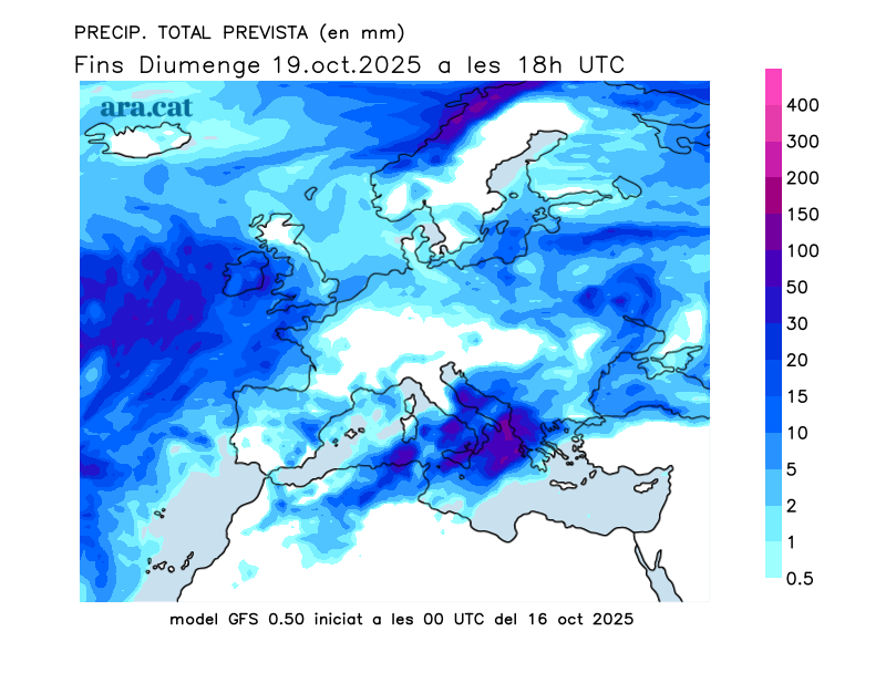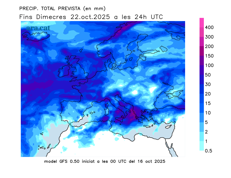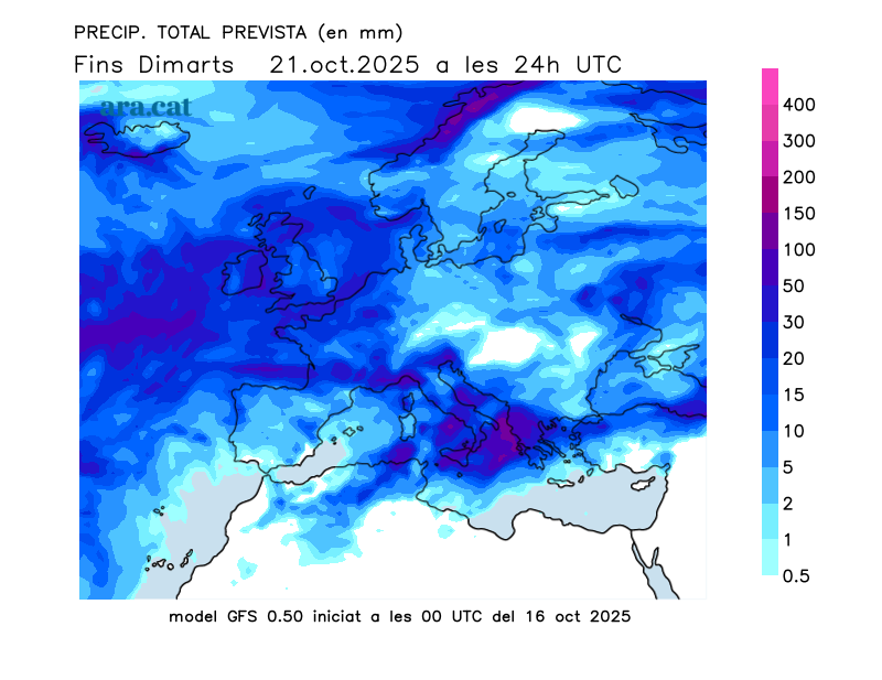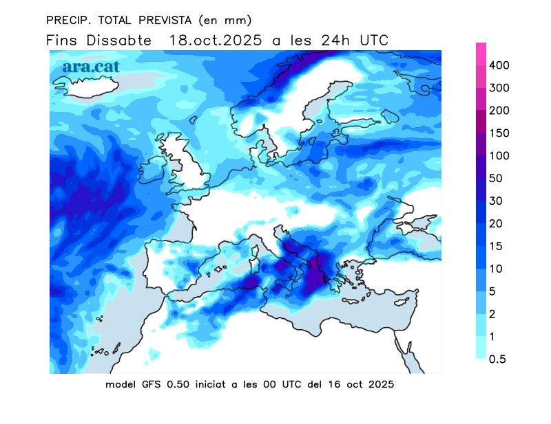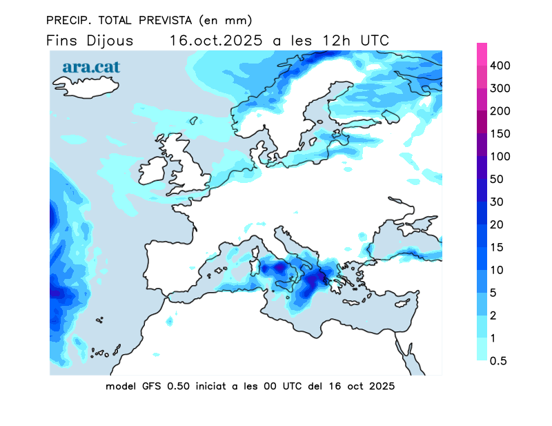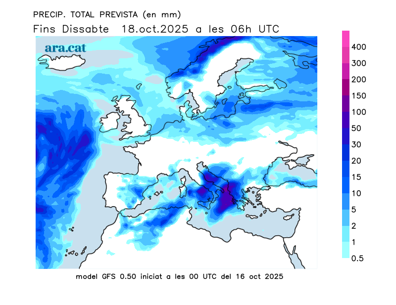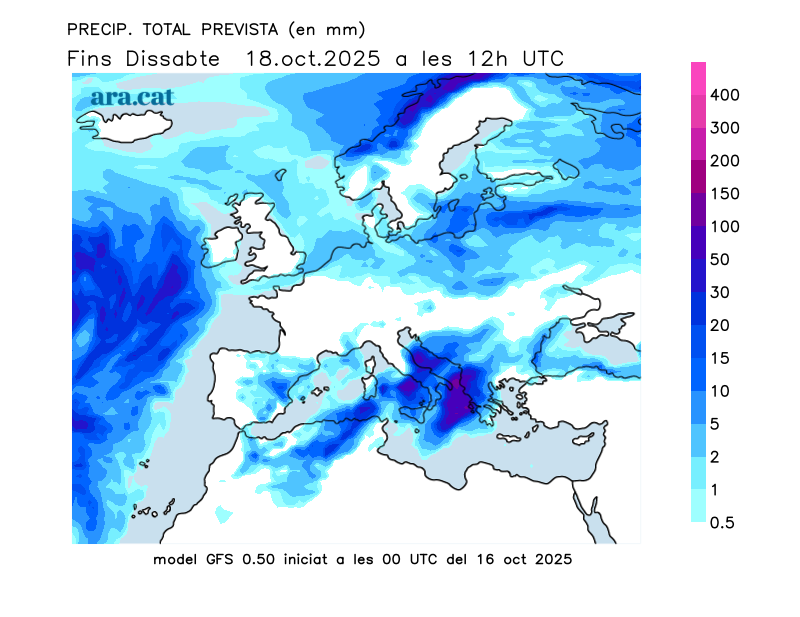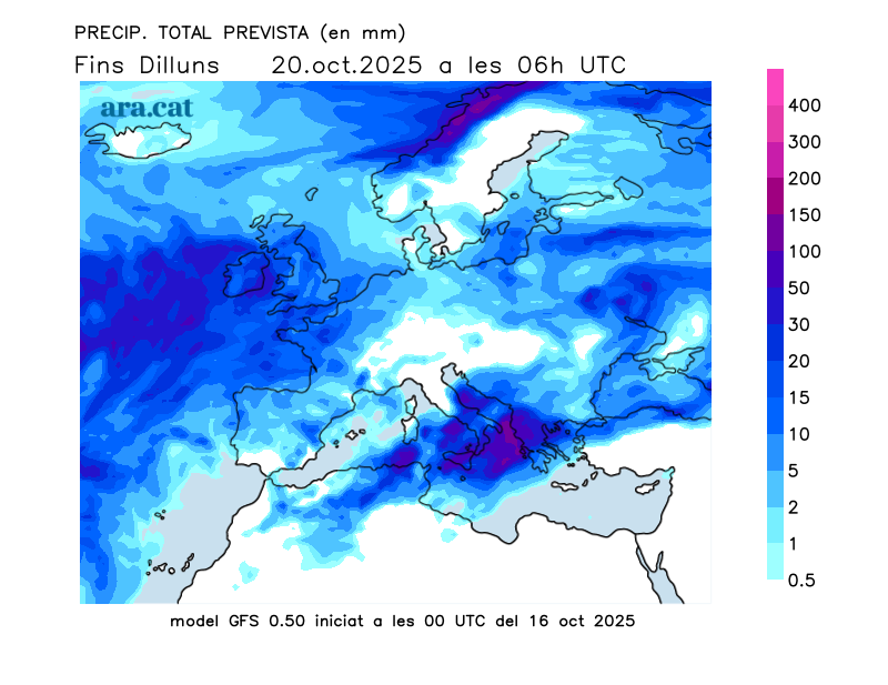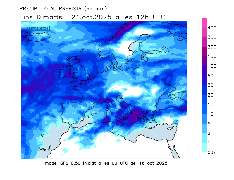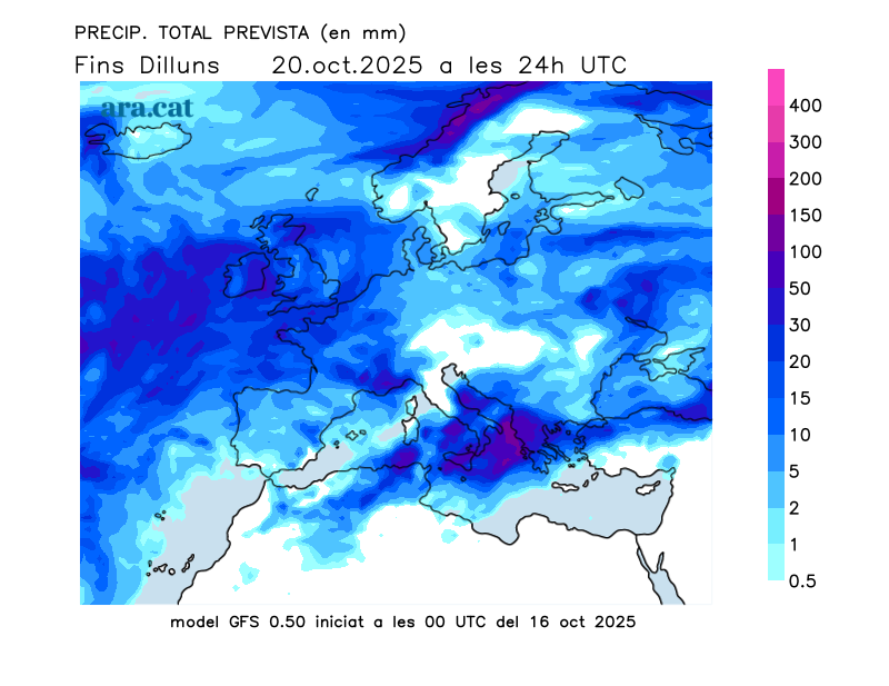 Acumulació total de precipitació prevista des de l’inici de la sortida del model (dades en l/m²).