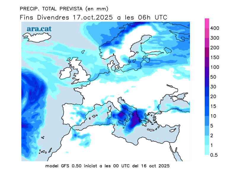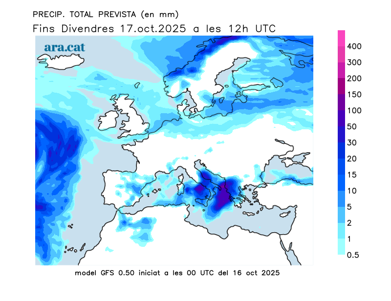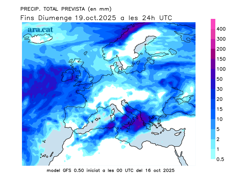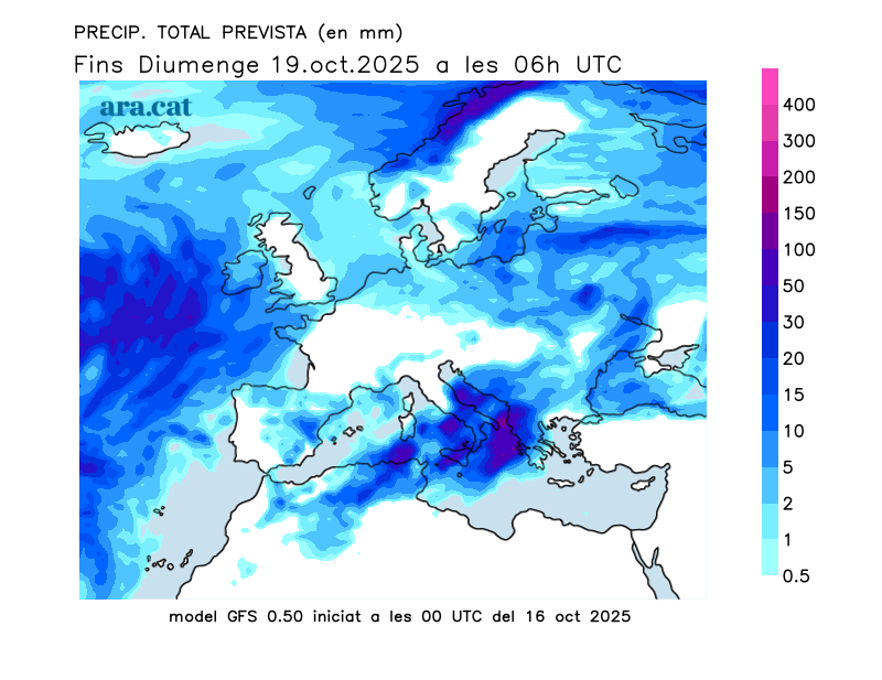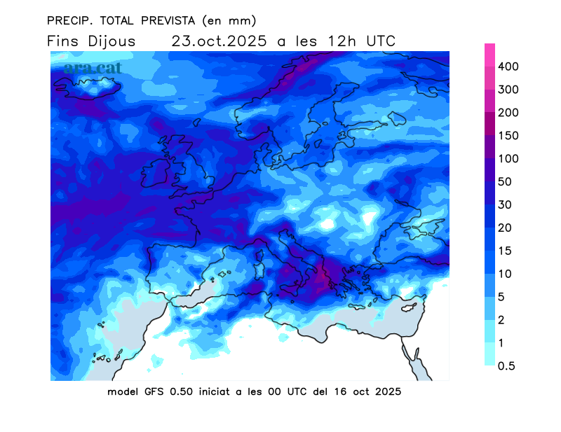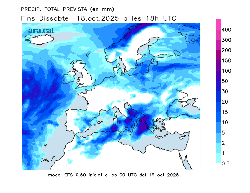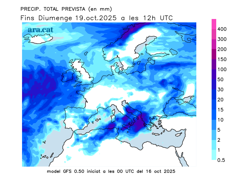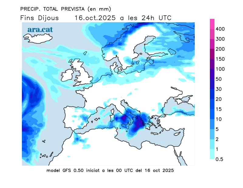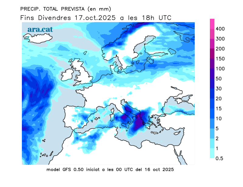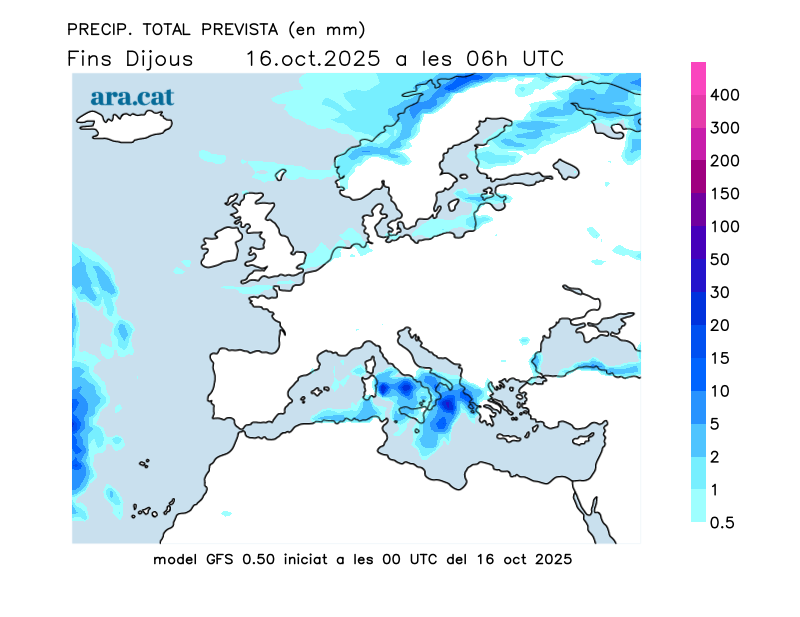 Acumulació total de precipitació prevista des de l’inici de la sortida del model (dades en l/m²).