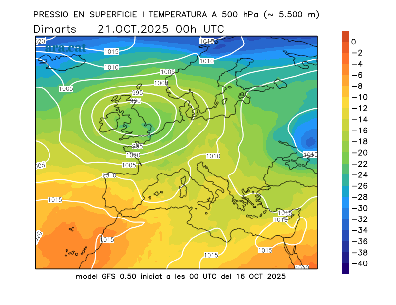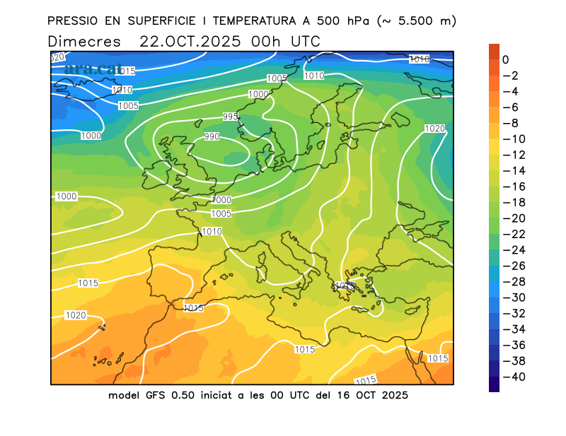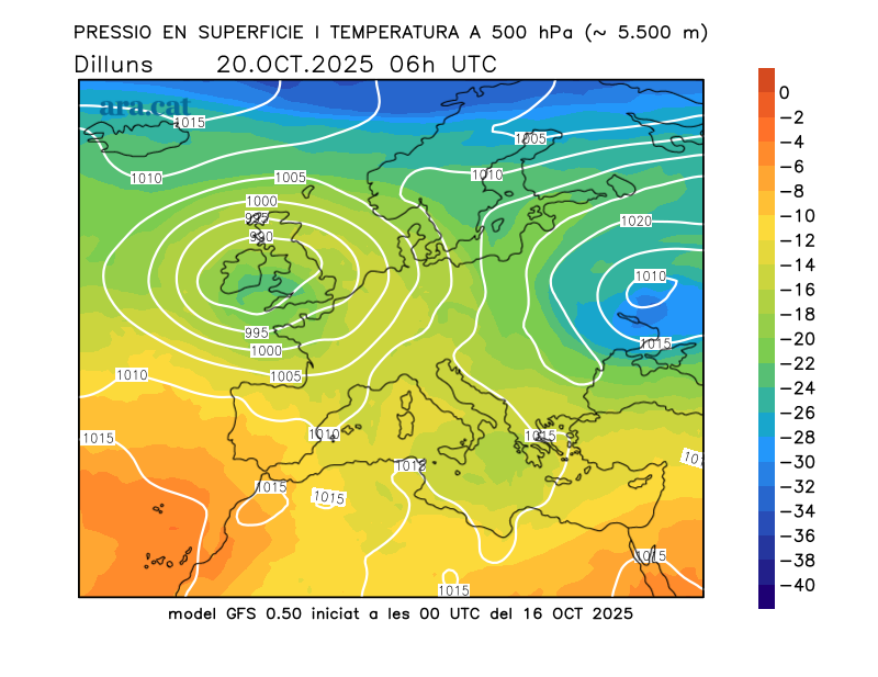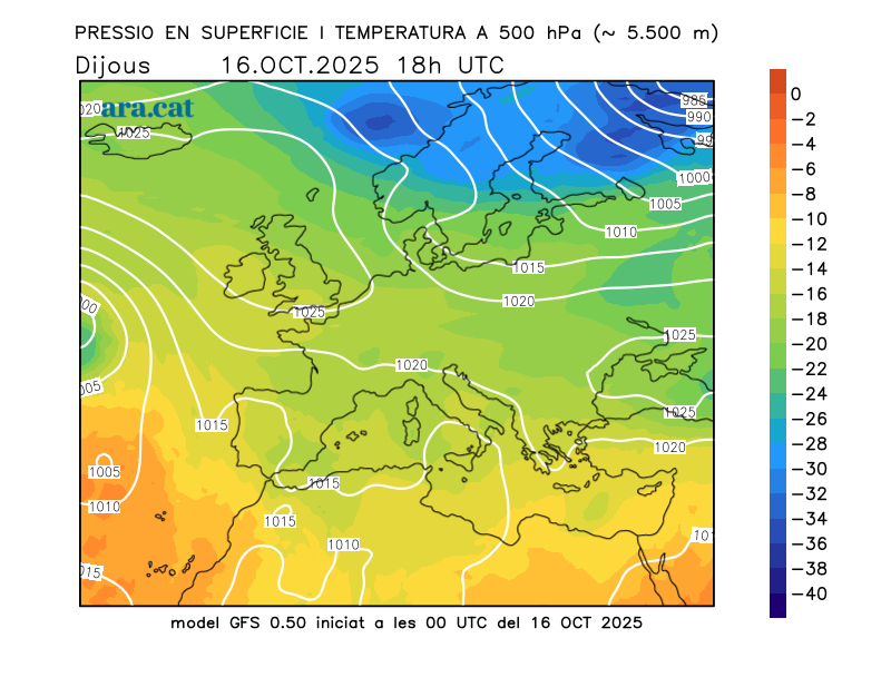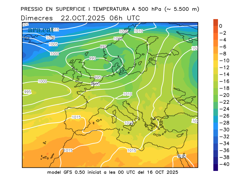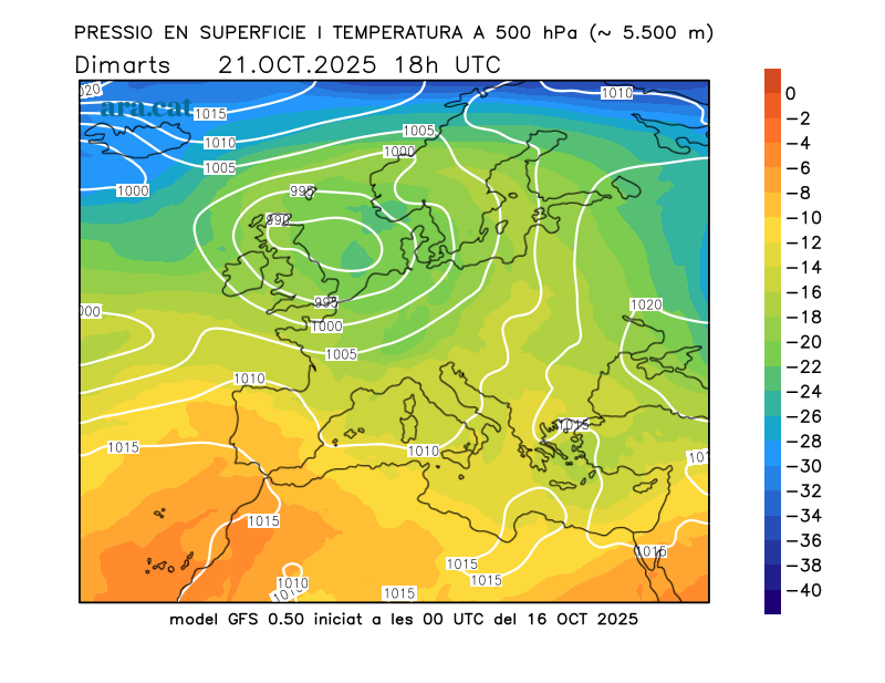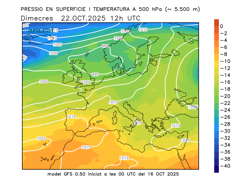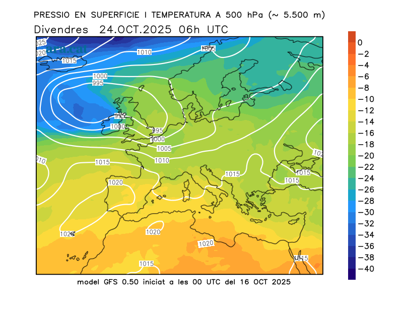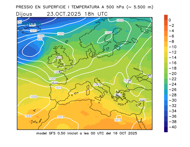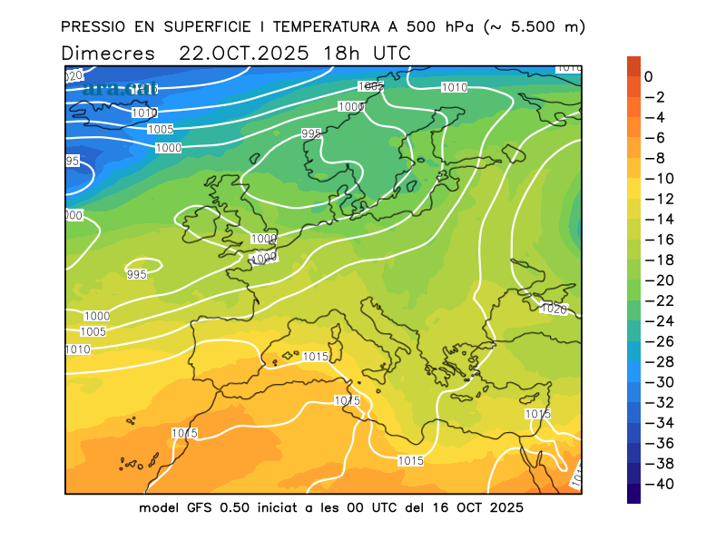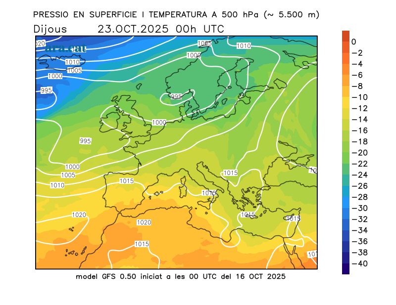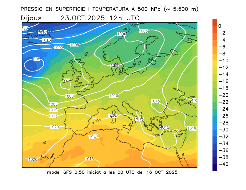 Pressió atmosfèrica en superfície i temperatura a la superfície de 500 hPa (aprox. 5500 m).
