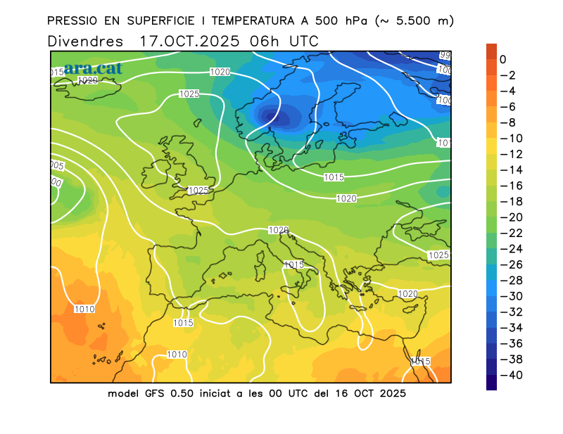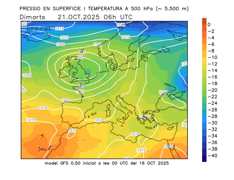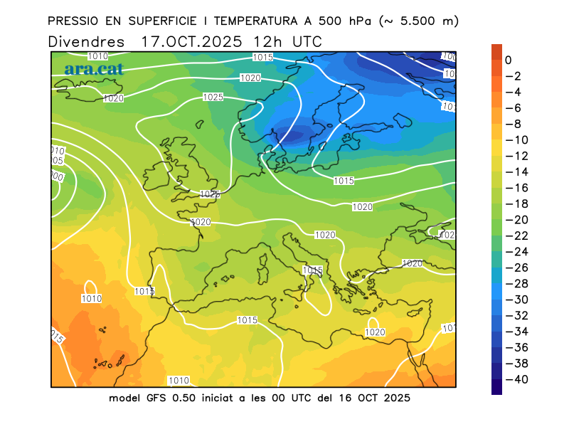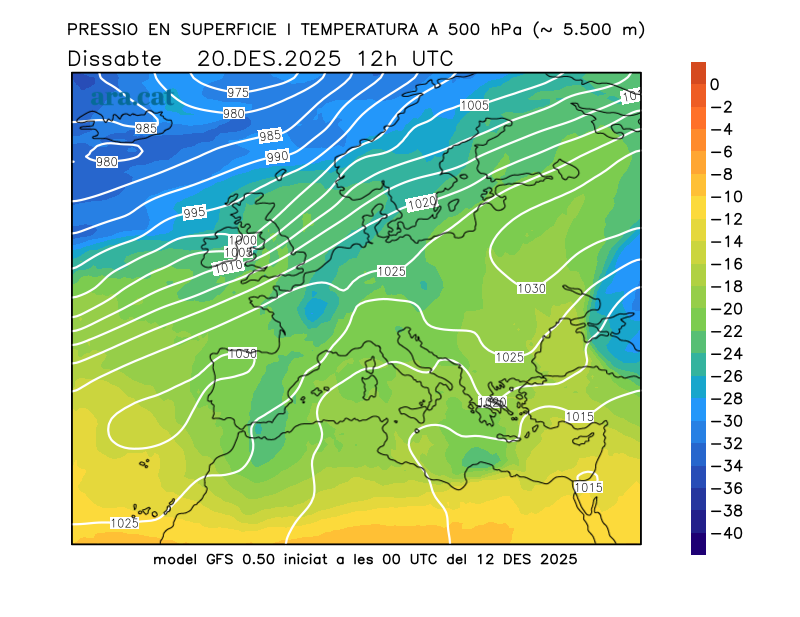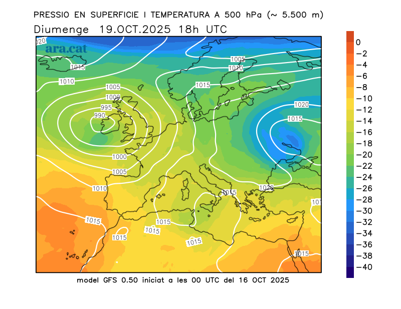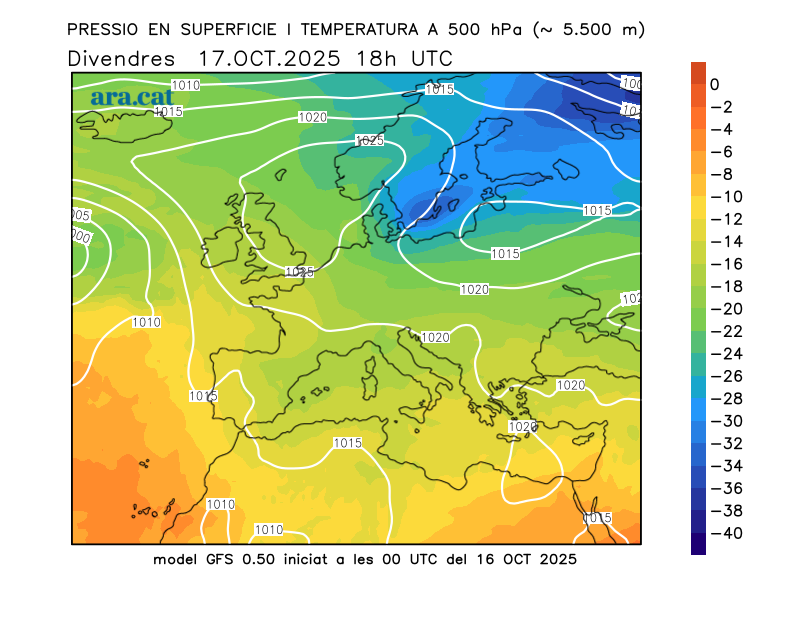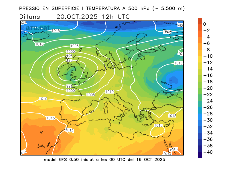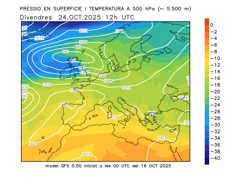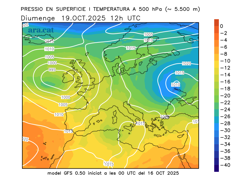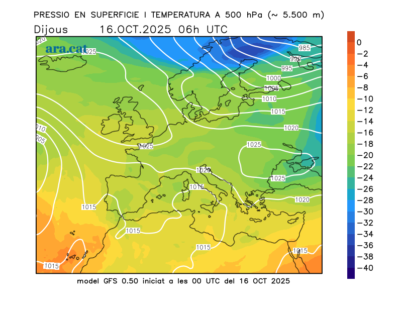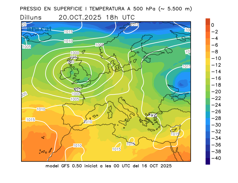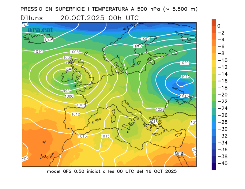 Pressió atmosfèrica en superfície i temperatura a la superfície de 500 hPa (aprox. 5500 m).